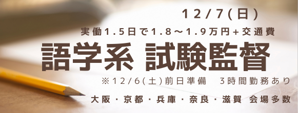 【語学系×試験監督】前日準備はたったの3時間!12/6・7!実働1.5日で1.8万円~!@大阪|京都|兵庫|奈良|滋賀