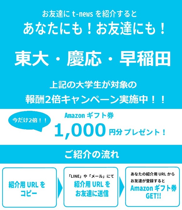 【東大・早稲田・慶応会員必見】新1年生紹介報酬2倍キャンペーン実施中!