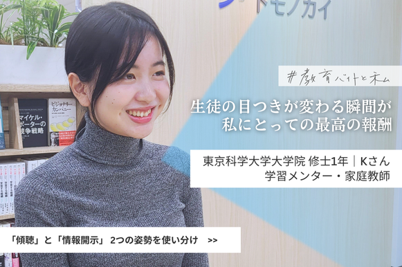 今回インタビューしたのは、東京科学大学大学院 環境・社会理工学院 修士1年のKさん。教育バイトは、学部1年から約4年半にわたり「学習メンター」として中高生のサポートを続け、「家庭教師」の経験もあります。 生徒の学習支援に留まらない、俯瞰した視点をもつKさんが見つけた “最高の報酬” とは一体何だったのでしょうか?