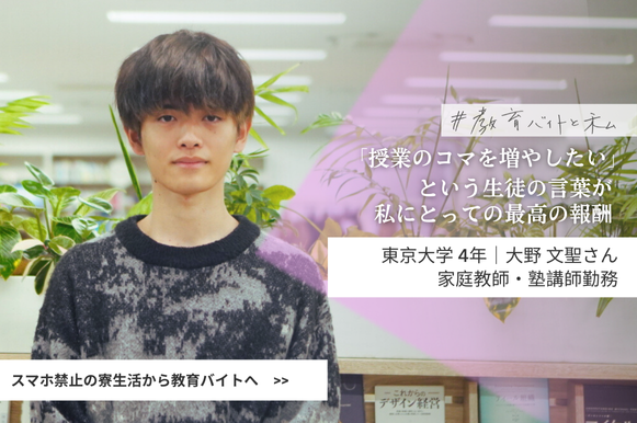 個別指導塾と家庭教師の2つの教育バイトで、小学生から高校生まで幅広い生徒の指導にあたってきました。自身の経験則に頼らず、生徒一人ひとりの特性に合わせて柔軟に指導方針を調整する大野さんが見つけた“最高の報酬”とは一体何だったのでしょうか。