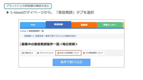 「東大家庭教師友の会」の案件は、共通昇給額に加えて「東大家庭教師の昇給額」も適用されます(最大昇給額は+550円となります)。