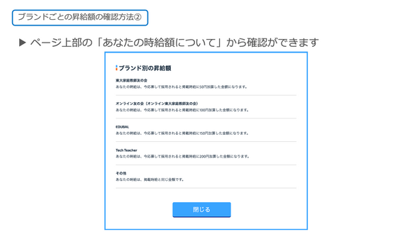 昇給条件・昇給額は、ブランドごと異なります。「東大家庭教師友の会」の案件に応募する際は「東大家庭教師友の会」の昇給額が、「EDUBAL」の案件に応募する際は「EDUBAL」の昇給額が適用されます。