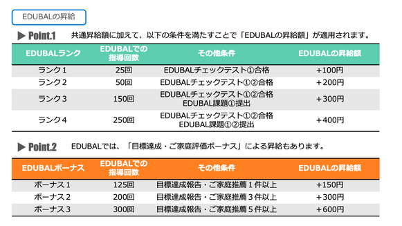 「EDUBALランク」によって、+400円までの昇給が可能です。このランクは、