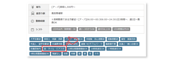 図の求人例では、勤務時間の欄に「6:00~00:30」「1日3時間~」と記載されています。これは、6:00~00:30の間で「3時間以上は働くことが条件」として求められているということです。決められた時間以上で働くことは可能なのか、自分の生活と照らし合わせて、応募前に想定しておきましょう。