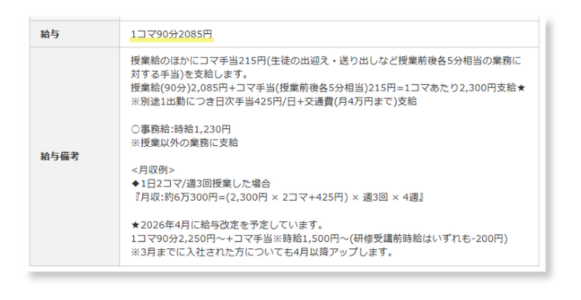 塾講師の給与体系は、「時給」の場合と1授業(コマ)あたりに対して給与が発生する「コマ給」とで分かれています。応募を検討している塾はどの給与体系なのかを確認しましょう!図の塾講師求人例では、1コマ90分の授業に対して「2,085円」の給与が支給されます。つまり、 時給換算すると「1,390円」です!