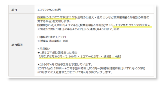 たとえば、例の場合は授業以外の業務に対して「時給1,230円」が発生すると記載されているだけでなく、授業前後の生徒の出迎えなどに対して5分相当の「コマ手当215円」が支給されます。